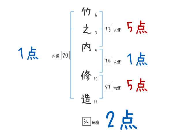 外運![]() | 竹之内修造さんの外運は20画の1つ星!社交が苦手。人とは違った才能があり波乱万丈な人生かも。 生活面を象徴する運勢です。外部から受ける影響力を表し、結婚運、家庭運や職場、環境への順応性を表します。 |