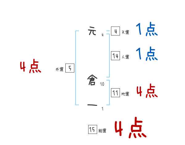 天運![]() | 元倉一さんの天運は4画の1つ星!感情が不安定で苦労するかも。周囲との協調を心掛けましょう。 家系が持つ宿命的な運勢を表します。祖先から受け継いだ苗字ですので自分の力が及びません。家柄を象徴します。 |
