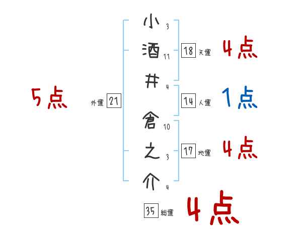 天運![]() | 小酒井倉之介さんの天運は18画の4つ星!情熱的で剛気。忍耐力があり信頼される。 家系が持つ宿命的な運勢を表します。祖先から受け継いだ苗字ですので自分の力が及びません。家柄を象徴します。 |