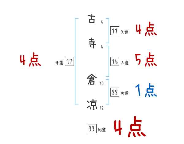 人運![]() | 古寺倉凉さんの人運は16画の5つ星!人望が厚く大きく発展する。逆転成功が見える。 性格や才能などを表す2番目に重要な運勢です。人間関係や協調性、社会的な成功に影響します。主に20歳から50歳ぐらいまでの中年期の運勢を表します。 |