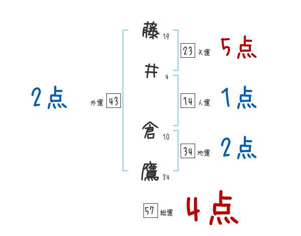天運![]() | 藤井倉鷹さんの天運は23画の5つ星!想像力に優れ活力がある。一代で成功し名誉を手に入れる。 家系が持つ宿命的な運勢を表します。祖先から受け継いだ苗字ですので自分の力が及びません。家柄を象徴します。 |