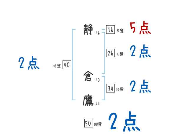 天運![]() | 静倉鷹さんの天運は16画の5つ星!人望が厚く大きく発展する。逆転成功が見える。 家系が持つ宿命的な運勢を表します。祖先から受け継いだ苗字ですので自分の力が及びません。家柄を象徴します。 |