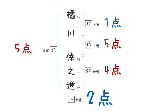 総運![]() | 橘川倖之進さんの総運は44画の2つ星!誠実で慎重な性格。物事を考えすぎないように注意しましょう。 あなたの人生を表す1番重要な運勢です。生涯を通じて影響する総合運となり、主に50歳以降の晩年期に影響を及ぼします。 |