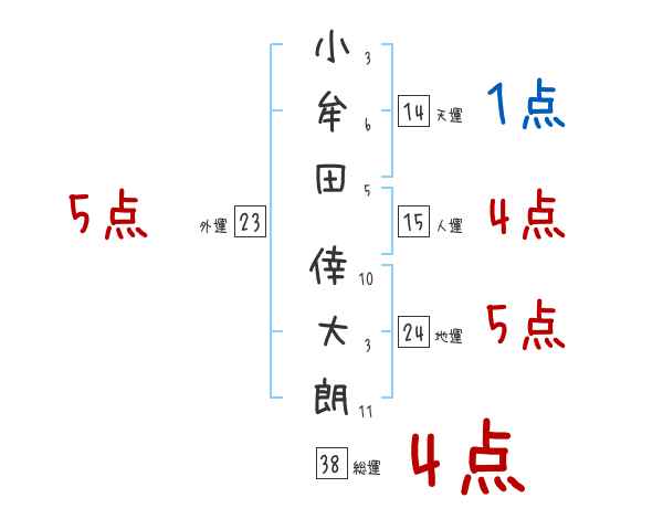 外運![]() | 小牟田倖大朗さんの外運は23画の5つ星!想像力に優れ活力がある。一代で成功し名誉を手に入れる。 生活面を象徴する運勢です。外部から受ける影響力を表し、結婚運、家庭運や職場、環境への順応性を表します。 |
