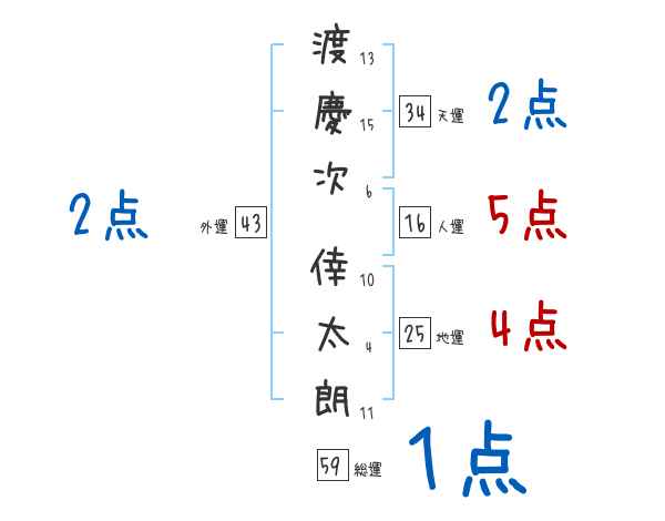 天運![]() | 渡慶次倖太朗さんの天運は34画の2つ星!独創性に優れるが、自尊心が強く災難に注意しましょう。 家系が持つ宿命的な運勢を表します。祖先から受け継いだ苗字ですので自分の力が及びません。家柄を象徴します。 |