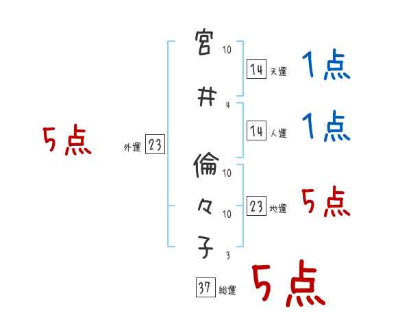 外運![]() | 宮井倫々子さんの外運は23画の5つ星!想像力に優れ活力がある。一代で成功し名誉を手に入れる。 生活面を象徴する運勢です。外部から受ける影響力を表し、結婚運、家庭運や職場、環境への順応性を表します。 |