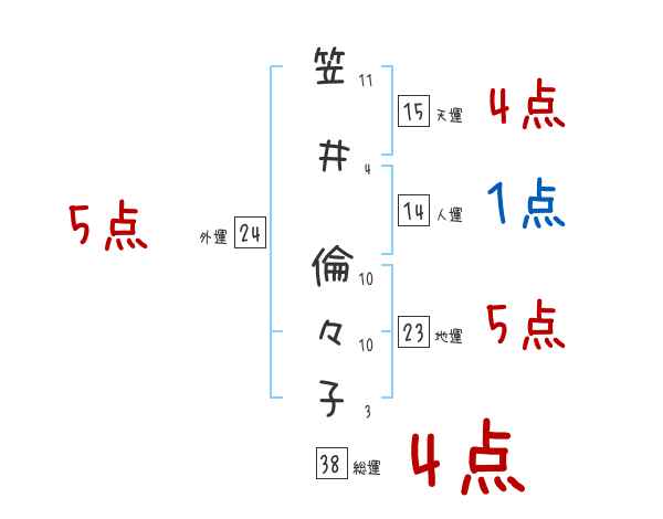外運![]() | 笠井倫々子さんの外運は24画の5つ星!家庭運が良く順調な人生。金運にも恵まれる。 生活面を象徴する運勢です。外部から受ける影響力を表し、結婚運、家庭運や職場、環境への順応性を表します。 |