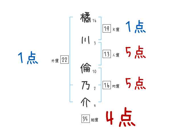 天運![]() | 橘川倫乃介さんの天運は19画の1つ星!優れた才能を持ちますが、協調性が足りないことも。周りの人と協力する事を意識しましょう。 家系が持つ宿命的な運勢を表します。祖先から受け継いだ苗字ですので自分の力が及びません。家柄を象徴します。 |