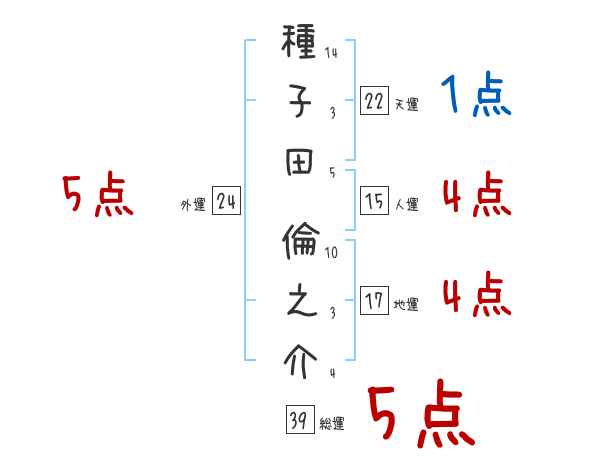 総運![]() | 種子田倫之介さんの総運は39画の5つ星!社交性に優れ人望が厚い。人の上に立ち成功する。 あなたの人生を表す1番重要な運勢です。生涯を通じて影響する総合運となり、主に50歳以降の晩年期に影響を及ぼします。 |