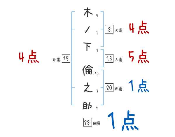 総運![]() | 木ノ下倫之助さんの総運は28画の1つ星!家庭環境に注意。スポーツで活躍できる能力があるかも。 あなたの人生を表す1番重要な運勢です。生涯を通じて影響する総合運となり、主に50歳以降の晩年期に影響を及ぼします。 |