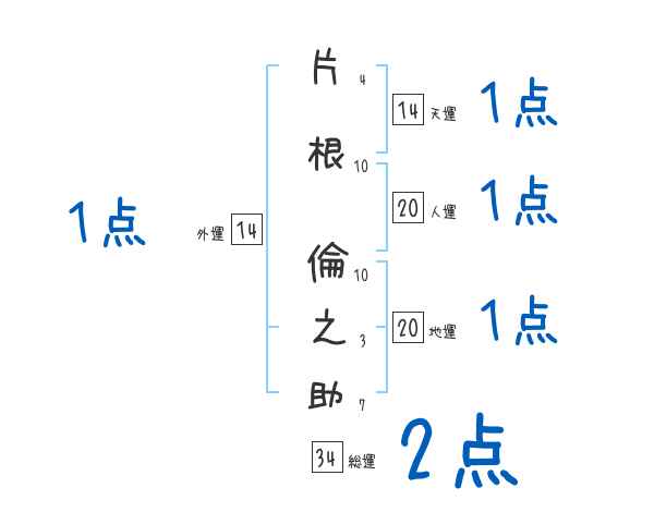 総運![]() | 片根倫之助さんの総運は34画の2つ星!独創性に優れるが、自尊心が強く災難に注意しましょう。 あなたの人生を表す1番重要な運勢です。生涯を通じて影響する総合運となり、主に50歳以降の晩年期に影響を及ぼします。 |