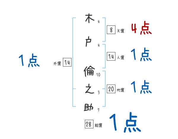 総運![]() | 木戸倫之助さんの総運は28画の1つ星!家庭環境に注意。スポーツで活躍できる能力があるかも。 あなたの人生を表す1番重要な運勢です。生涯を通じて影響する総合運となり、主に50歳以降の晩年期に影響を及ぼします。 |