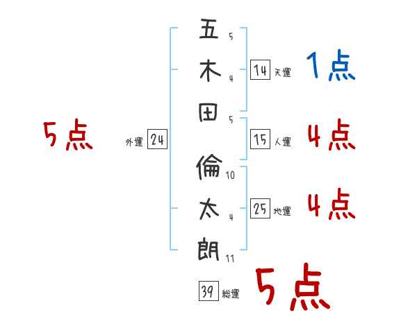 総運![]() | 五木田倫太朗さんの総運は39画の5つ星!社交性に優れ人望が厚い。人の上に立ち成功する。 あなたの人生を表す1番重要な運勢です。生涯を通じて影響する総合運となり、主に50歳以降の晩年期に影響を及ぼします。 |
