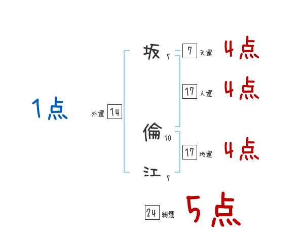 天運![]() | 坂倫江さんの天運は7画の4つ星!強い意志や信念を持ち独立心が強い。自立する。 家系が持つ宿命的な運勢を表します。祖先から受け継いだ苗字ですので自分の力が及びません。家柄を象徴します。 |