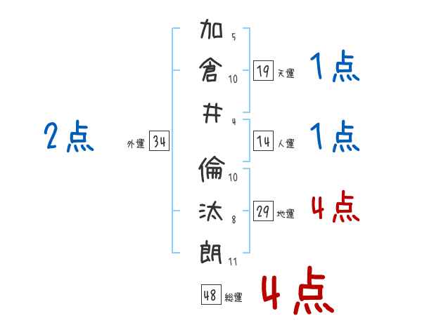 総運![]() | 加倉井倫汰朗さんの総運は48画の4つ星!賢明な性格で人望が厚い。指導力があり多くの人に尊敬される。 あなたの人生を表す1番重要な運勢です。生涯を通じて影響する総合運となり、主に50歳以降の晩年期に影響を及ぼします。 |