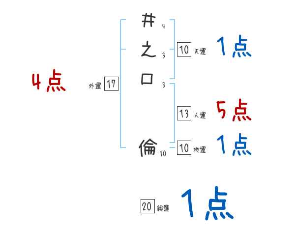 人運![]() | 井之口倫さんの人運は13画の5つ星!才能に恵まれ人気がある。名声を手に入れる。円満な人生。 性格や才能などを表す2番目に重要な運勢です。人間関係や協調性、社会的な成功に影響します。主に20歳から50歳ぐらいまでの中年期の運勢を表します。 |