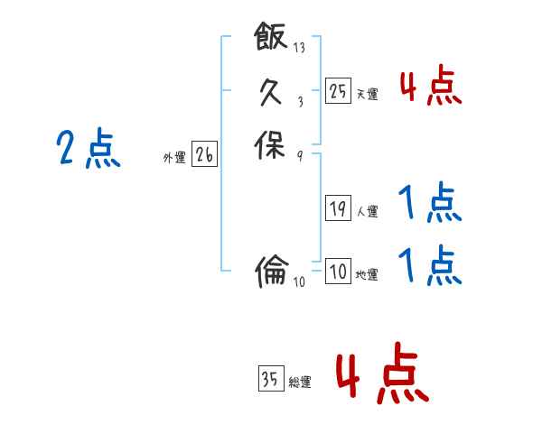 天運![]() | 飯久保倫さんの天運は25画の4つ星!個性があり才能があふれる。強運の持ち主で発展する。 家系が持つ宿命的な運勢を表します。祖先から受け継いだ苗字ですので自分の力が及びません。家柄を象徴します。 |