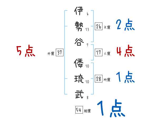 外運![]() | 伊勢谷倭琉武さんの外運は37画の5つ星!努力家で順応性に優れる。現実的な考え方ができ忠実に物事をこなす。 生活面を象徴する運勢です。外部から受ける影響力を表し、結婚運、家庭運や職場、環境への順応性を表します。 |