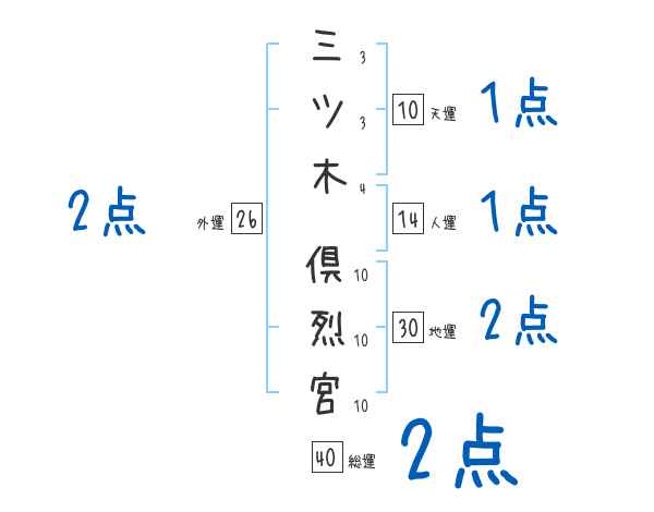 外運![]() | 三ツ木倶烈宮さんの外運は26画の2つ星!波瀾万丈かも。信頼できる人を大事にしましょう。 生活面を象徴する運勢です。外部から受ける影響力を表し、結婚運、家庭運や職場、環境への順応性を表します。 |