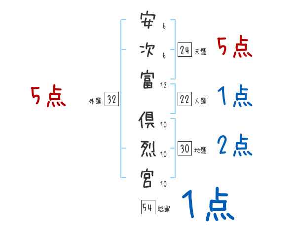 天運![]() | 安次富倶烈宮さんの天運は24画の5つ星!家庭運が良く順調な人生。金運にも恵まれる。 家系が持つ宿命的な運勢を表します。祖先から受け継いだ苗字ですので自分の力が及びません。家柄を象徴します。 |