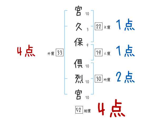 総運![]() | 宮久保倶烈宮さんの総運は52画の4つ星!先見性と独創性に優れ考える力がある。強運の持ち主。 あなたの人生を表す1番重要な運勢です。生涯を通じて影響する総合運となり、主に50歳以降の晩年期に影響を及ぼします。 |