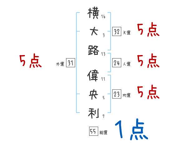 天運![]() | 横大路偉央利さんの天運は32画の5つ星!柔軟性があり成功する。チャンスが多く金運が良い。 家系が持つ宿命的な運勢を表します。祖先から受け継いだ苗字ですので自分の力が及びません。家柄を象徴します。 |