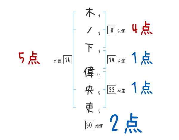 外運![]() | 木ノ下偉央吏さんの外運は16画の5つ星!人望が厚く大きく発展する。逆転成功が見える。 生活面を象徴する運勢です。外部から受ける影響力を表し、結婚運、家庭運や職場、環境への順応性を表します。 |