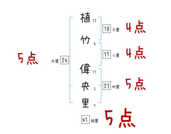 外運![]() | 植竹偉央里さんの外運は24画の5つ星!家庭運が良く順調な人生。金運にも恵まれる。 生活面を象徴する運勢です。外部から受ける影響力を表し、結婚運、家庭運や職場、環境への順応性を表します。 |