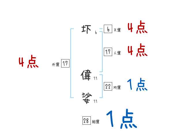 外運![]() | 圷偉娑さんの外運は17画の4つ星!積極的な行動力。地位を気づき財産を手に入れる。純粋な心と直感力。 生活面を象徴する運勢です。外部から受ける影響力を表し、結婚運、家庭運や職場、環境への順応性を表します。 |