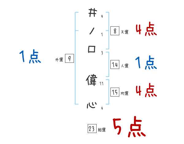 地運![]() | 井ノ口偉心さんの地運は15画の4つ星!人徳があり出世する。順調に物事を進め円満な人生。 個性を表す基礎的な運勢です。性格形成や対人関係、行動力など家庭環境に影響されます。主に誕生してから20歳くらいまでの若年期の運勢を表します。 |