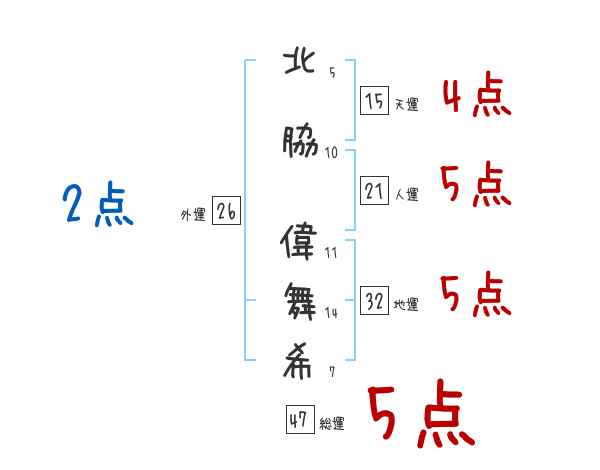 総運![]() | 北脇偉舞希さんの総運は47画の5つ星!実力が開花し発展する円満な人生。財に恵まれる。 あなたの人生を表す1番重要な運勢です。生涯を通じて影響する総合運となり、主に50歳以降の晩年期に影響を及ぼします。 |