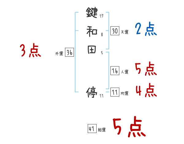 人運![]() | 鍵和田停さんの人運は16画の5つ星!人望が厚く大きく発展する。逆転成功が見える。 性格や才能などを表す2番目に重要な運勢です。人間関係や協調性、社会的な成功に影響します。主に20歳から50歳ぐらいまでの中年期の運勢を表します。 |