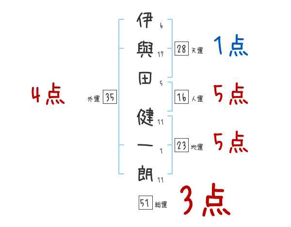 外運![]() | 伊與田健一朗さんの外運は35画の4つ星!温厚な性格で感受性が高い。穏和な性格で人望が厚い。 生活面を象徴する運勢です。外部から受ける影響力を表し、結婚運、家庭運や職場、環境への順応性を表します。 |