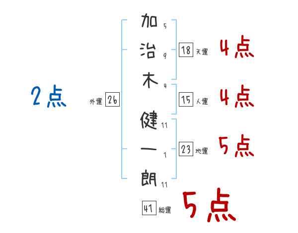人運![]() | 加治木健一朗さんの人運は15画の4つ星!人徳があり出世する。順調に物事を進め円満な人生。 性格や才能などを表す2番目に重要な運勢です。人間関係や協調性、社会的な成功に影響します。主に20歳から50歳ぐらいまでの中年期の運勢を表します。 |