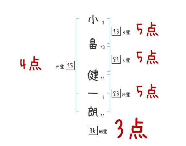総運![]() | 小畠健一朗さんの総運は36画の3つ星!先見性が豊かです。多少神経質で苦労することも。 あなたの人生を表す1番重要な運勢です。生涯を通じて影響する総合運となり、主に50歳以降の晩年期に影響を及ぼします。 |