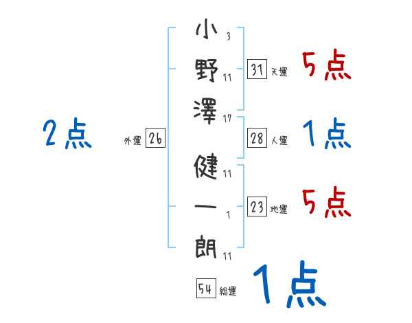 総運![]() | 小野澤健一朗さんの総運は54画の1つ星!トラブルが多いかも。周りをよく見て協調して過ごしましょう。 あなたの人生を表す1番重要な運勢です。生涯を通じて影響する総合運となり、主に50歳以降の晩年期に影響を及ぼします。 |
