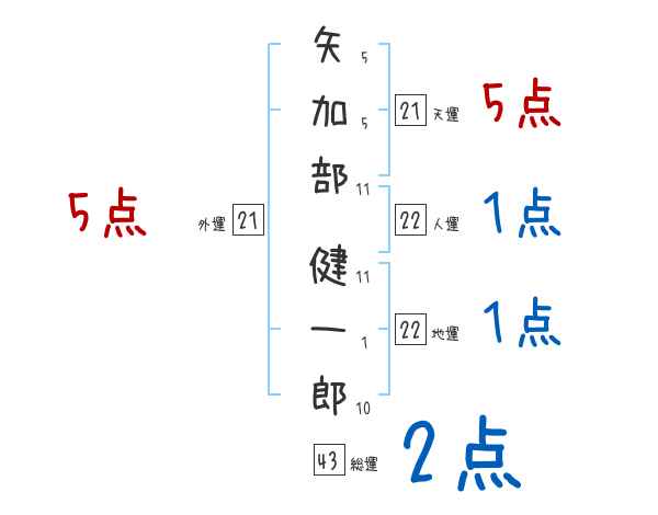 天運![]() | 矢加部健一郎さんの天運は21画の5つ星!統率力がある。独立し成功する。名誉を手に入れる。 家系が持つ宿命的な運勢を表します。祖先から受け継いだ苗字ですので自分の力が及びません。家柄を象徴します。 |