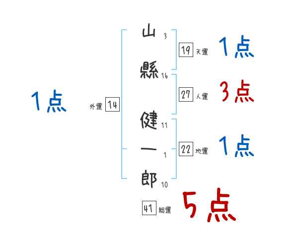 総運![]() | 山縣健一郎さんの総運は41画の5つ星!大志を抱き、目標に向かって実力を発揮し達成する。温和な性格。 あなたの人生を表す1番重要な運勢です。生涯を通じて影響する総合運となり、主に50歳以降の晩年期に影響を及ぼします。 |