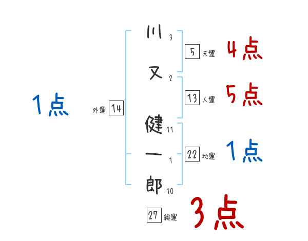 天運![]() | 川又健一郎さんの天運は5画の4つ星!健康で安泰。協調性に優れ、財産に恵まれる。 家系が持つ宿命的な運勢を表します。祖先から受け継いだ苗字ですので自分の力が及びません。家柄を象徴します。 |