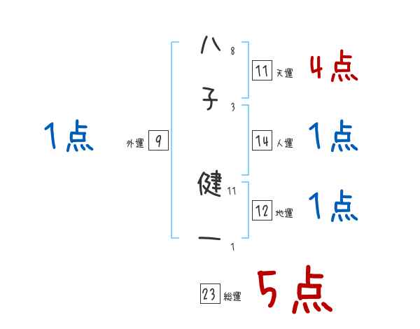 天運![]() | 八子健一さんの天運は11画の4つ星!着実に富や地位を得る幸運な人生。 家系が持つ宿命的な運勢を表します。祖先から受け継いだ苗字ですので自分の力が及びません。家柄を象徴します。 |