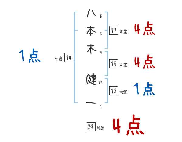 人運![]() | 八本木健一さんの人運は15画の4つ星!人徳があり出世する。順調に物事を進め円満な人生。 性格や才能などを表す2番目に重要な運勢です。人間関係や協調性、社会的な成功に影響します。主に20歳から50歳ぐらいまでの中年期の運勢を表します。 |