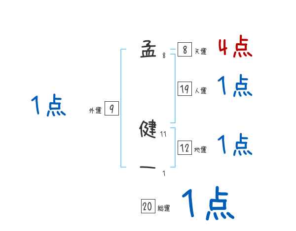 天運![]() | 孟健一さんの天運は8画の4つ星!勤勉家。根気強く努力し成功する。忍耐力がある。 家系が持つ宿命的な運勢を表します。祖先から受け継いだ苗字ですので自分の力が及びません。家柄を象徴します。 |
