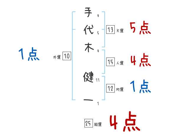 天運![]() | 手代木健一さんの天運は13画の5つ星!才能に恵まれ人気がある。名声を手に入れる。円満な人生。 家系が持つ宿命的な運勢を表します。祖先から受け継いだ苗字ですので自分の力が及びません。家柄を象徴します。 |