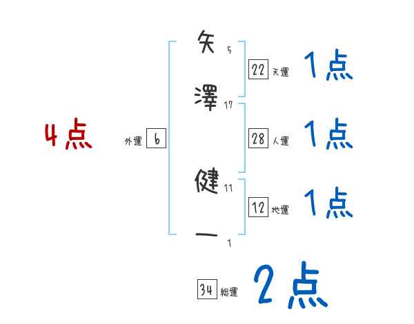 総運![]() | 矢澤健一さんの総運は34画の2つ星!独創性に優れるが、自尊心が強く災難に注意しましょう。 あなたの人生を表す1番重要な運勢です。生涯を通じて影響する総合運となり、主に50歳以降の晩年期に影響を及ぼします。 |