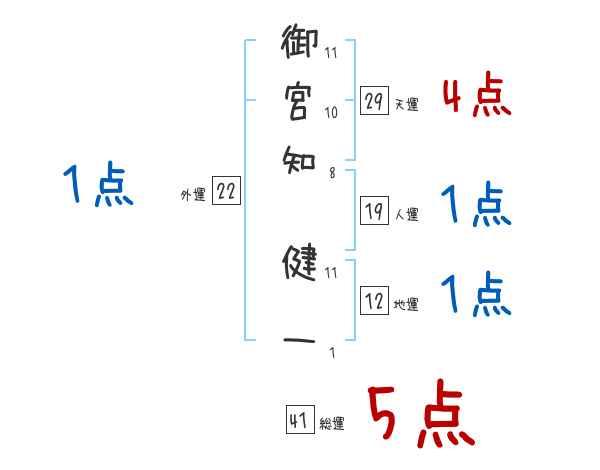 外運![]() | 御宮知健一さんの外運は22画の1つ星!努力することが苦手ないっぽう手先が器用。芸術性にも優れる。 生活面を象徴する運勢です。外部から受ける影響力を表し、結婚運、家庭運や職場、環境への順応性を表します。 |