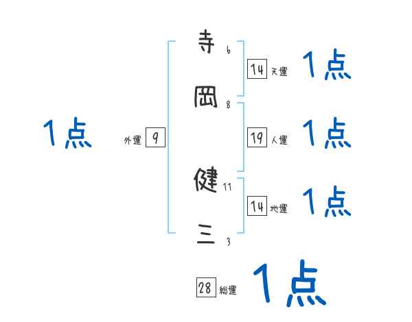 天運![]() | 寺岡健三さんの天運は14画の1つ星!人に対して優しいがストレスを溜め込みがち。人間関係のトラブルを避けるよう気をつけましょう。 家系が持つ宿命的な運勢を表します。祖先から受け継いだ苗字ですので自分の力が及びません。家柄を象徴します。 |