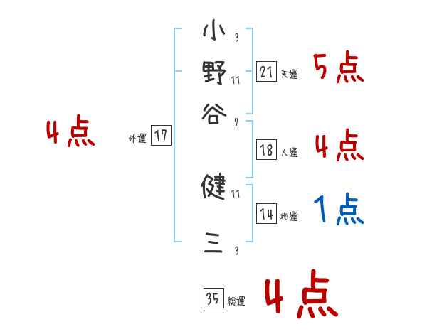 総運![]() | 小野谷健三さんの総運は35画の4つ星!温厚な性格で感受性が高い。穏和な性格で人望が厚い。 あなたの人生を表す1番重要な運勢です。生涯を通じて影響する総合運となり、主に50歳以降の晩年期に影響を及ぼします。 |