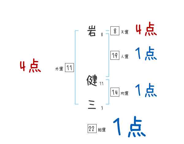 天運![]() | 岩健三さんの天運は8画の4つ星!勤勉家。根気強く努力し成功する。忍耐力がある。 家系が持つ宿命的な運勢を表します。祖先から受け継いだ苗字ですので自分の力が及びません。家柄を象徴します。 |