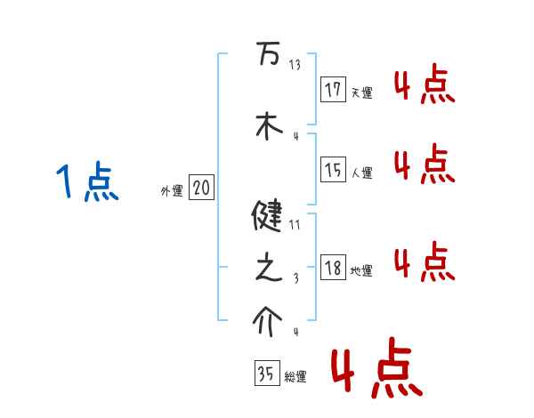 総運![]() | 万木健之介さんの総運は35画の4つ星!温厚な性格で感受性が高い。穏和な性格で人望が厚い。 あなたの人生を表す1番重要な運勢です。生涯を通じて影響する総合運となり、主に50歳以降の晩年期に影響を及ぼします。 |