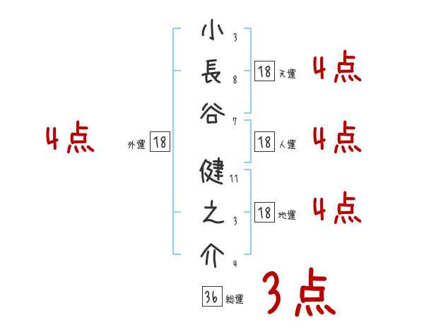 総運![]() | 小長谷健之介さんの総運は36画の3つ星!先見性が豊かです。多少神経質で苦労することも。 あなたの人生を表す1番重要な運勢です。生涯を通じて影響する総合運となり、主に50歳以降の晩年期に影響を及ぼします。 |